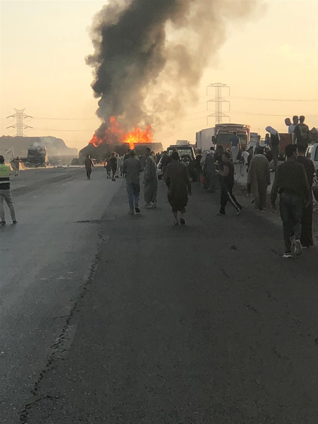 حريق هائل ومصابون في اصطدام سيارة مواد بترولية بسيارتين أخريين بالطريق الإقليمي (صور)