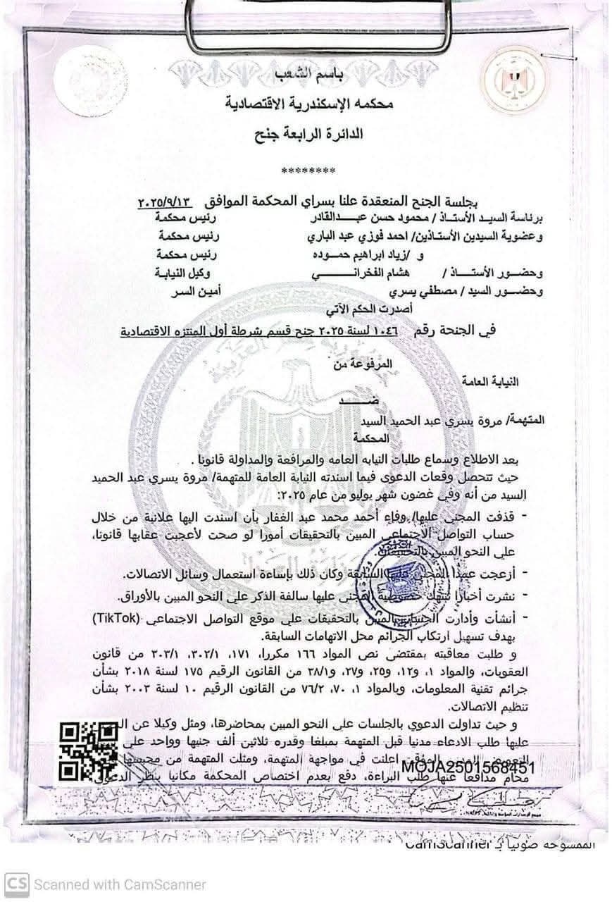 كشفت محكمة الإسكندرية الاقتصادية برئاسة المستشار محمود حسن، عن حيثيات حكمها في القضية رقم ١٠٤٦ لسنة ٢٠٢٥، والخاصة بالحكم على المتهمة مروة يسري عبدالحميد والمعروفة باسم مروة ابنه مبارك المزعومة، والذي حكم عليها بسنتين حبس وغرامة ١٠٠ ألف جنيه.