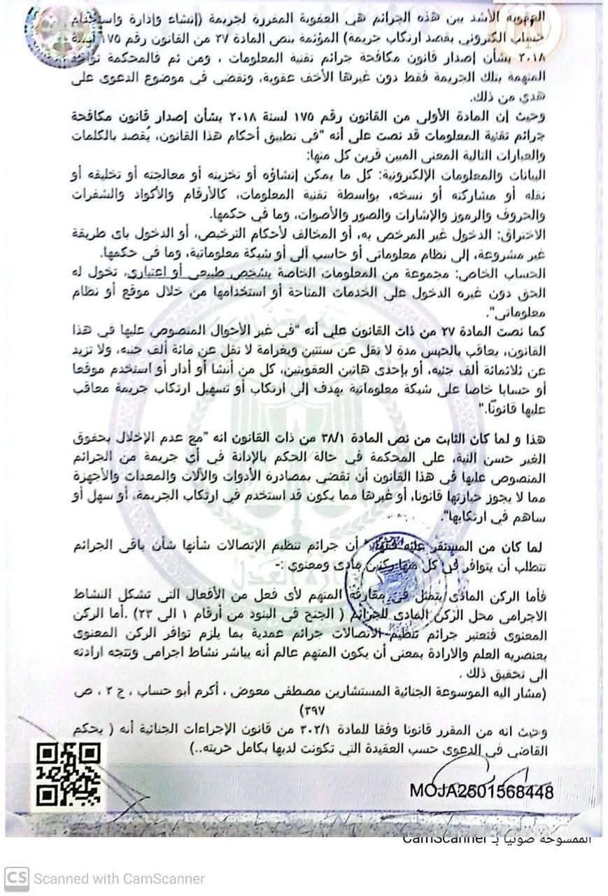 وقالت المحكمة في حيثيات حكمها، إن النيابة العامة أسندت اتهامات قذف المجني عليها وفاء أحمد محمد الشهيرة بوفاء عامر، وذلك علنا على حسابه بموقع التواصل الاجتماعي تيك توك، كما أزعجت عمدا المجني عليها، وذلك بإساءة استعمال موقع التواصل الاجتماعي ونشرت تنتهك خصوصية المجني عليها.