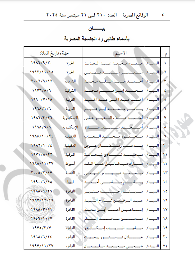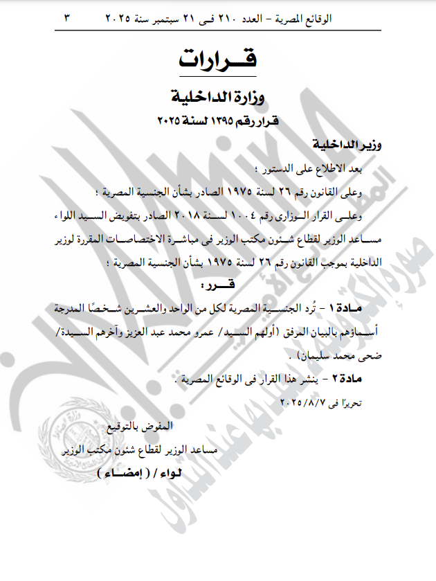 -قرار وزارة الداخلية رقم 1395 لسنة 2025، بشأن رد الجنسية المصرية لكل من الواحد والعشرين شخـصًا المدرجة أسماؤهم (أولهم عمرو محمد عبد العزيز وآخرهم ضحى محمد سليمان).