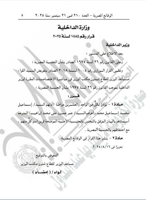 -وقرار وزارة الداخلية رقم 1485 لسنة 2025ن بشأن الأذن لكل من الـ21 مواطنًا (أولهم إسماعيل محمد إسماعيل، وآخرهم عمر عمرو على محمد إبراهيم) بـالتجنس بالجنسية الأجنبية، مع احتفاظهم بالجنسية المصرية.