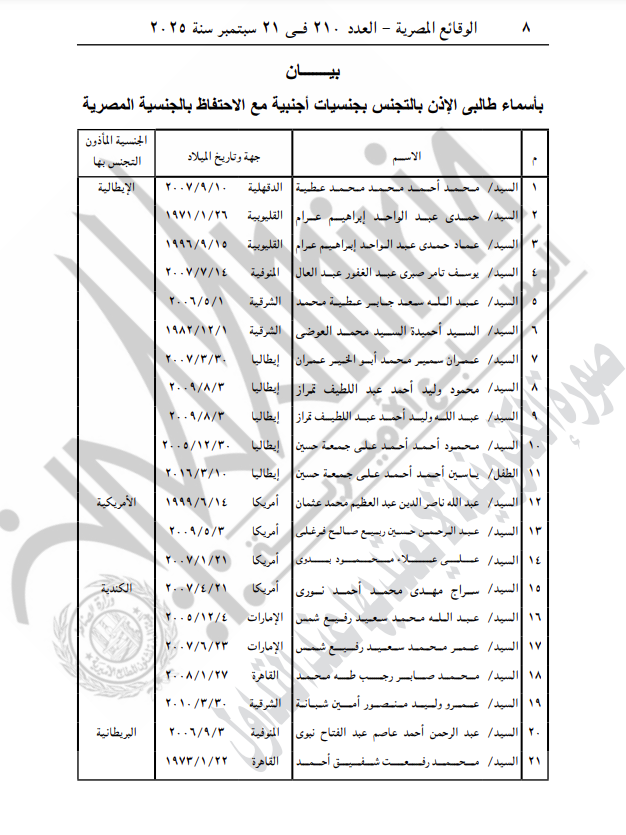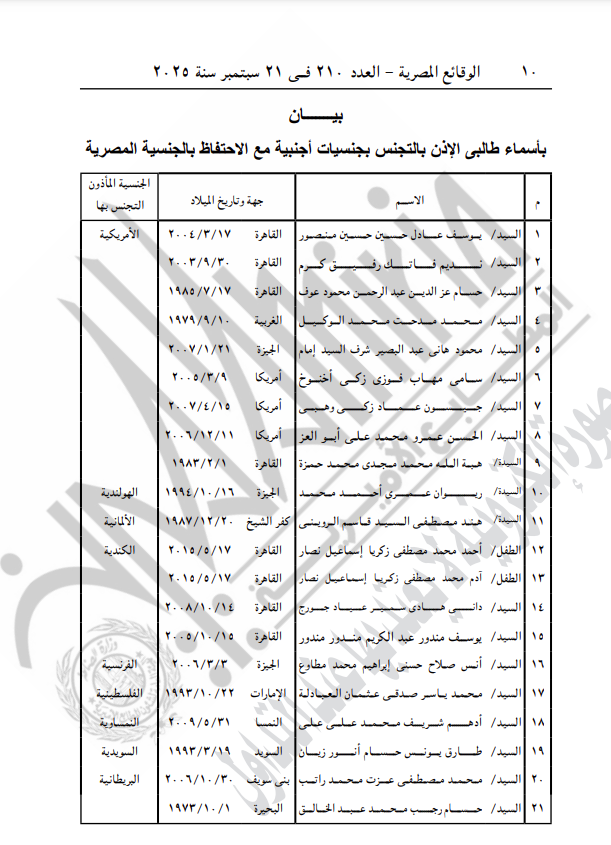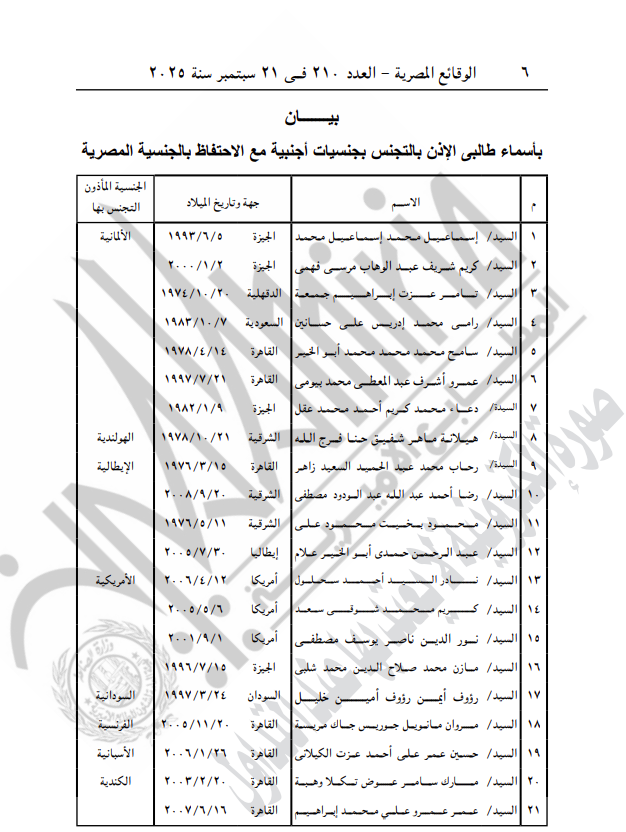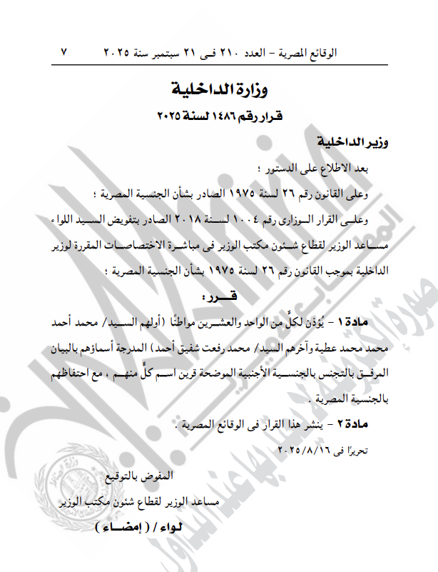 -وقرار وزارة الداخلية رقم 1486 لسنة 2025، بالإذن لكل من الـ 21 مواطنًا (أولهم محمد محمد عطية، وآخرهم محمد رفعت شفيق أحمد) بالتجنس بالجنسية الأجنبية، مع احتفاظهم بالجنسية المصرية.
