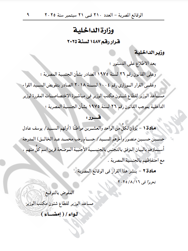-وقرار وزارة الداخلية رقم 1487 لسنة 2025، بشأن الأذن لكل من الـ21 مواطنًا، (أولهم يوسف عادل حسين حسين منصور، وآخرهم حسام رجب محمد عبد الخالق) بالتجنس بالجنسية الأجنبية، مع احتفاظهم بالجنسية المصرية.