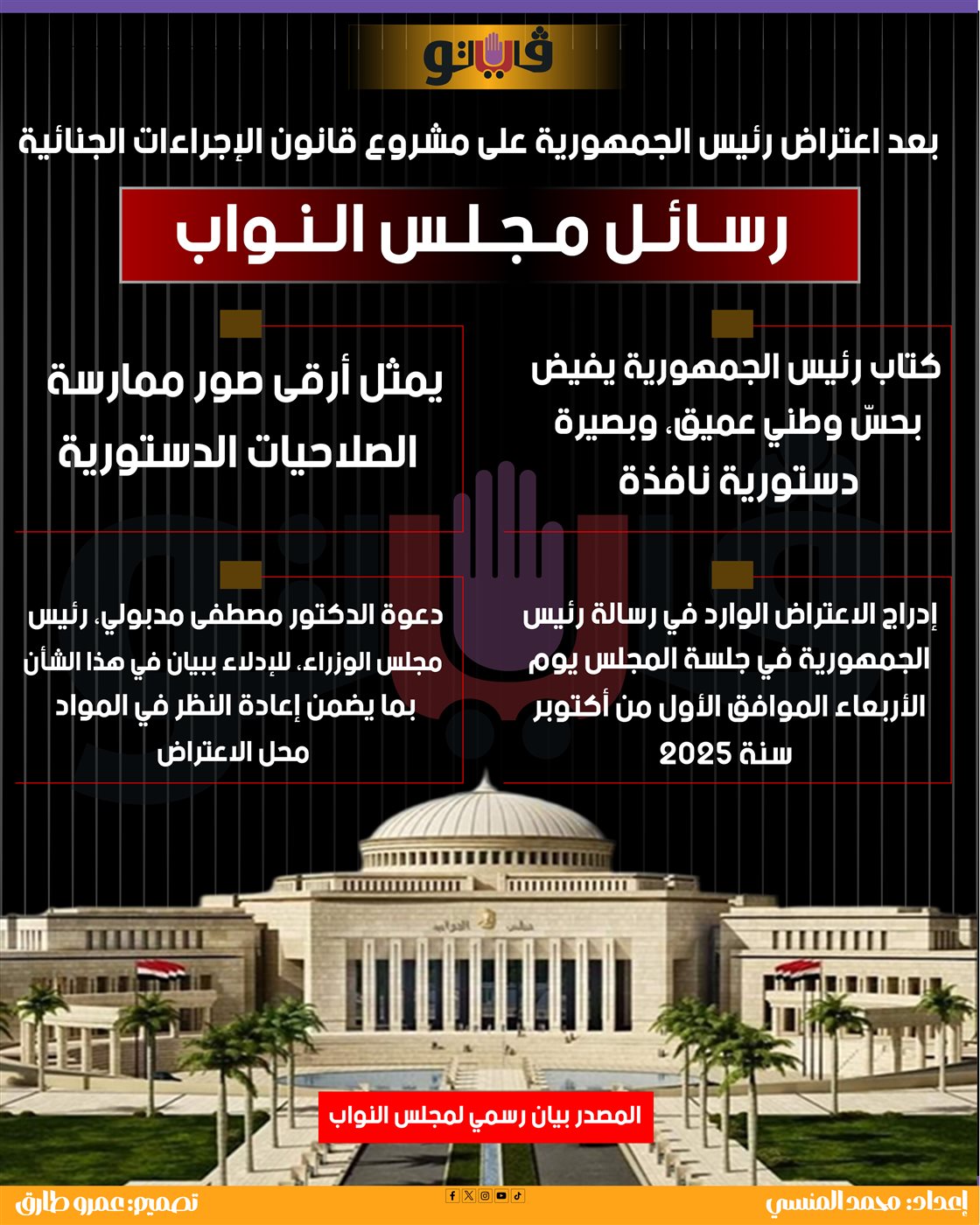 بعد اعتراض رئيس الجمهورية على مشروع قانون الإجراءات الجنائية.. رسائل مجلس النواب (إنفوجراف)