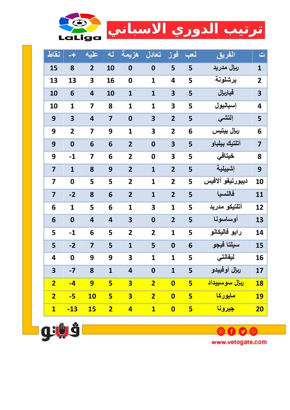 ترتيب الدوري الإسباني بعد الجولة الخامسة