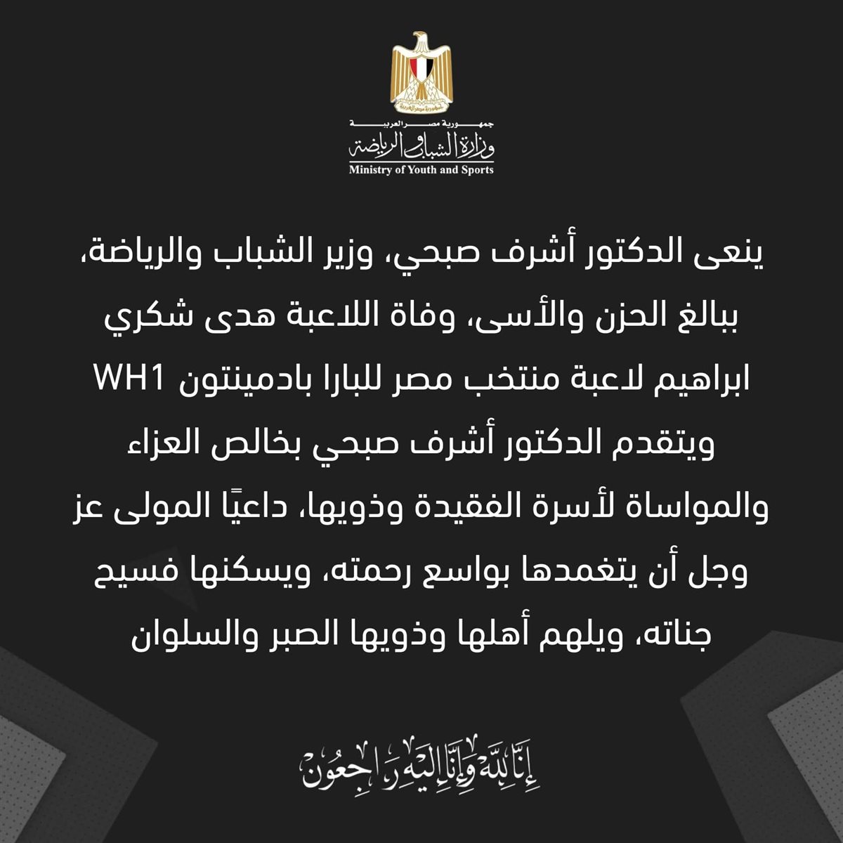 كما نعى الدكتور أشرف صبحي وزير الشباب والرياضة في بيان رسمي اليوم الإثنين عبر الصفحة الرسمية للوزارة عبر فيس بوك البطلة هدى شكري لاعبة المنتخب الوطني.
