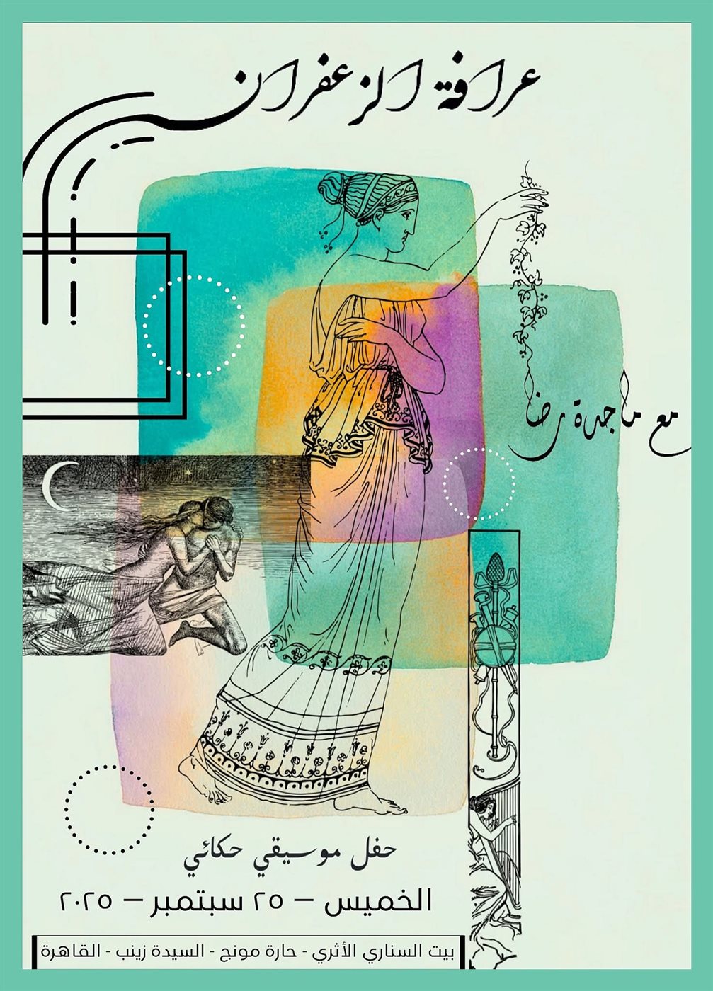 تنظم مكتبة الإسكندرية من خلال بيت السناري الأثري بالقاهرة، التابع لقطاع التواصل الثقافي، حفلًا موسيقيًا حكائيًا بعنوان «عرافة الزعفران»، وذلك يوم الخميس الموافق 25 سبتمبر 2025، في تمام الساعة الثامنة مساءً، بمقر بيت السناري بحي السيدة زينب.