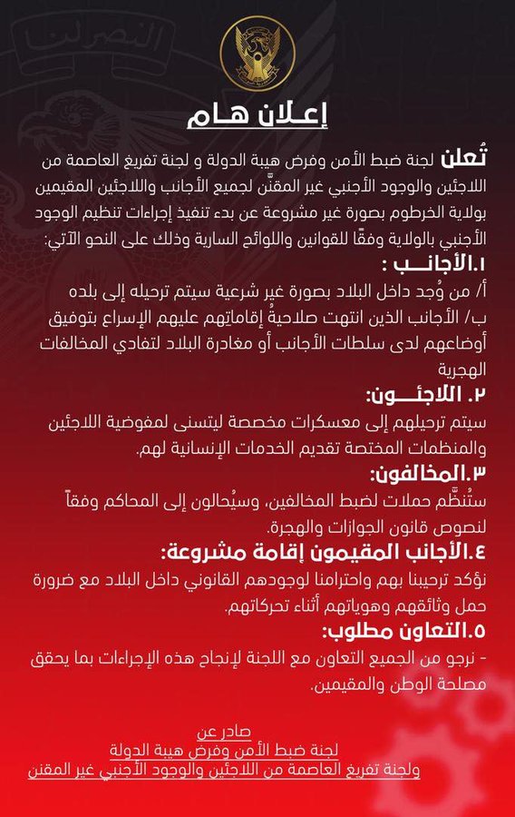 وكشف المنشور الصادر عن لجنة ضبط الأمن وفرض هيبة الدولة في السودان أن الأجانب الموجودين داخل السودان بصورة غير شرعية ستتم إعادتهم إلى بلدانهم، حيث دعت اللجنة الأجانب، الذين انتهت صلاحية إقاماتهم إلى الإسراع بتوفيق أوضاعهم لدى سلطات الأجانب، أو مغادرة البلاد لتفادي المخالفات والتهجير.