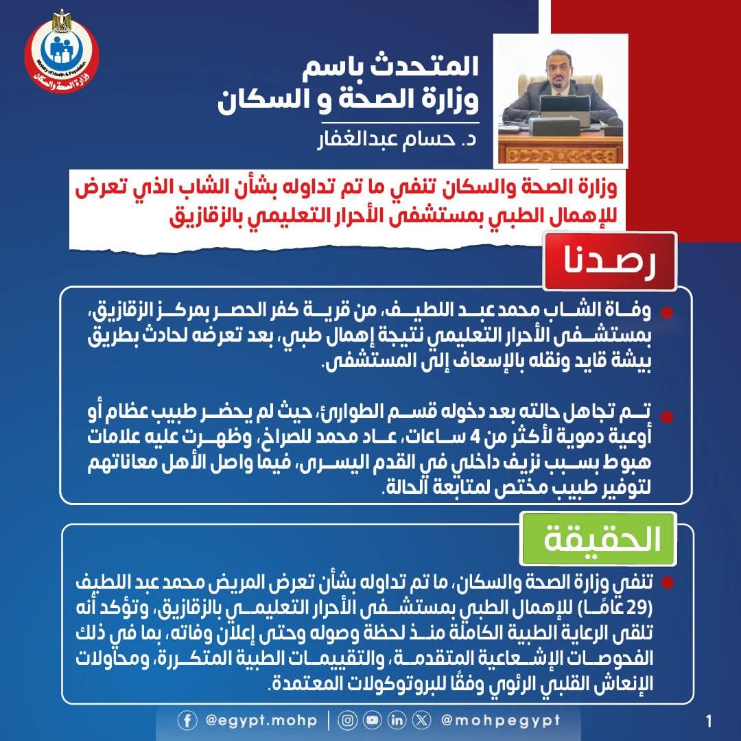 الصحة تكشف حقيقة وفاة شاب بمستشفى الأحرار التعليمي بالزقازيق بسبب الإهمال الطبي