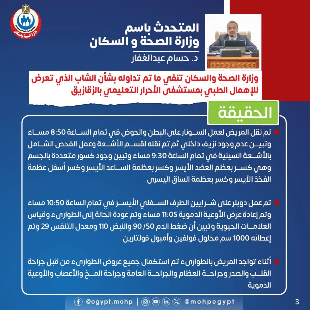 نفى الدكتور حسام عبدالغفار، المتحدث الرسمي لوزارة الصحة والسكان، ما تم تداوله عبر بعض منصات التواصل الاجتماعي بشأن تعرض الشاب محمد عبداللطيف (29 عامًا) من قرية كفر الحصر بمركز الزقازيق، للإهمال الطبي بمستشفى الأحرار التعليمي، مؤكدًا أنه تلقى الرعاية الطبية الكاملة منذ لحظة وصوله وحتى إعلان وفاته.