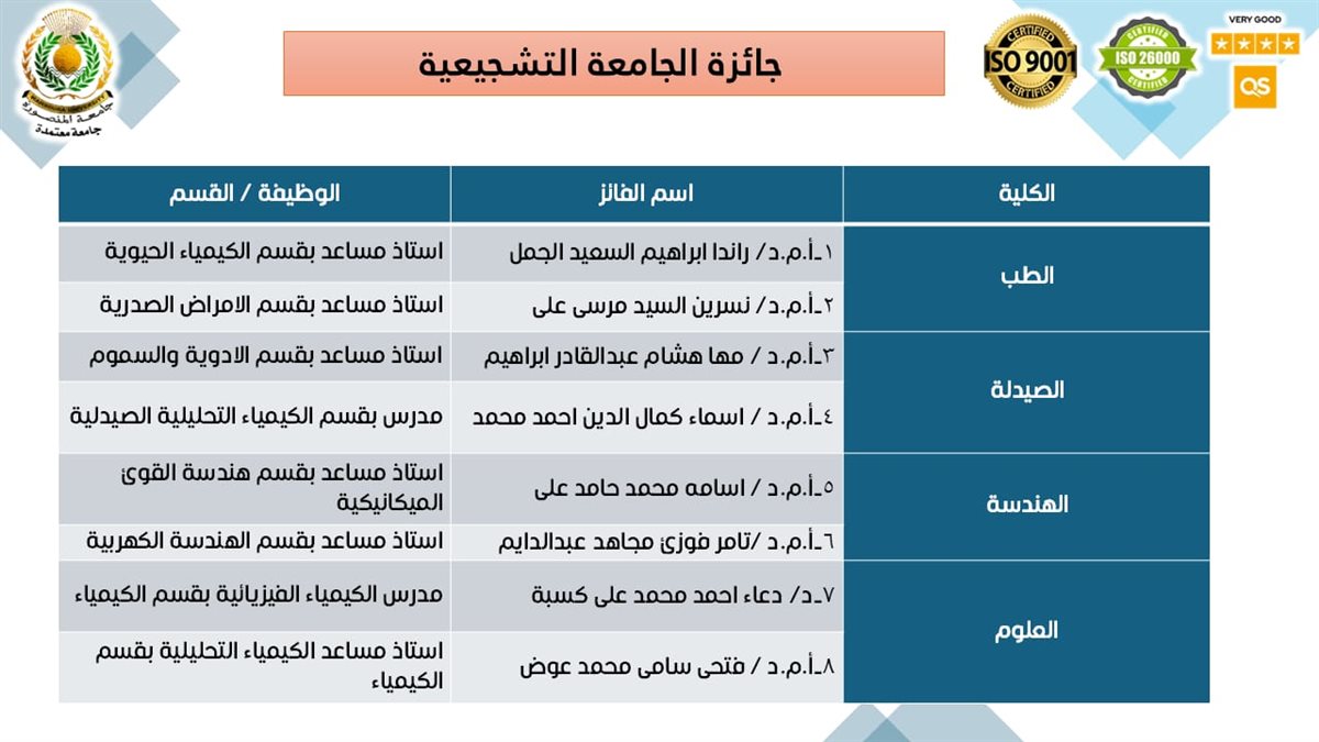 وفي جوائز الجامعة التشجيعية، جاءت الأسماء الفائزة على النحو التالي: من كلية الطب الدكتورة راندا إبراهيم السعيد الجمل – أستاذ مساعد بقسم الكيمياء الحيوية، والدكتورة نسرين السيد مرسي علي – أستاذ مساعد بقسم الأمراض الصدرية.