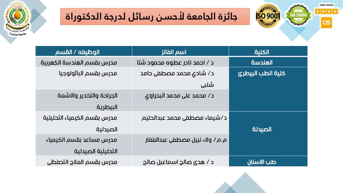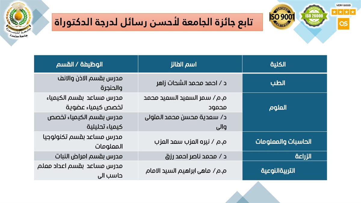 وفي جوائز الجامعة لأفضل الرسائل العلمية (الدكتوراه)، فاز بها كل من: الدكتور أحمد نادر عطوة محمود شتا – مدرس بقسم الهندسة الكهربية بكلية الهندسة، والدكتور شادي محمد مصطفى حامد شلبي – مدرس بقسم الباثولوجيا بكلية الطب البيطري، والدكتور محمد علي محمد البحراوي – مدرس بقسم الجراحة والتخدير والأشعة البيطرية بكلية الطب البيطري، والدكتورة شيماء مصطفى محمد عبدالحليم – مدرس بقسم الكيمياء التحليلية الصيدلية بكلية الصيدلة، والمدرس المساعد ولاء نبيل مصطفى عبدالغفار – بقسم الكيمياء التحليلية الصيدلية بكلية الصيدلة، والدكتورة هدى صالح إسماعيل صالح – مدرس بقسم العلاج التحفظي بكلية طب الأسنان، والدكتور أحمد محمد الشحات زاهر – مدرس بقسم الأنف والأذن والحنجرة بكلية الطب، والمدرس المساعد سمر السعيد السعيد محمد محمود – بقسم الكيمياء (كيمياء عضوية) بكلية العلوم، والدكتورة سعدية محسن محمد المتولي والي – مدرس بقسم الكيمياء (كيمياء تحليلية) بكلية العلوم، والمدرس المساعد نيرة العزب سعد العزب – بقسم تكنولوجيا المعلومات بكلية الحاسبات والمعلومات، والدكتور محمد ناصر أحمد رزق – مدرس بقسم أمراض النبات بكلية الزراعة، والمدرس المساعد ماهي إبراهيم السيد الإمام – بقسم إعداد معلم حاسب آلي بكلية التربية النوعية.