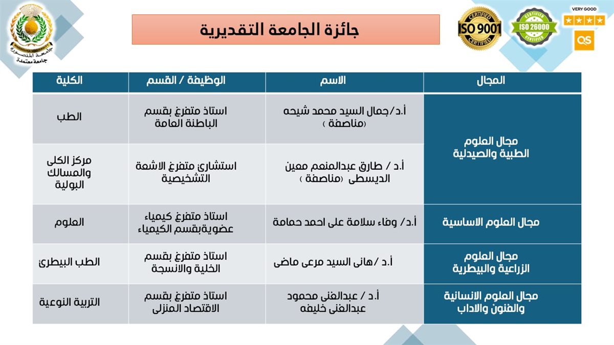 جامعة المنصورة تعلن أسماء الفائزين بجوائز الجامعة للعام 2025