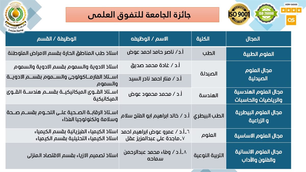 والدكتور خالد إبراهيم أبو الفتح سلام – أستاذ الرقابة الصحية على اللحوم بكلية الطب البيطري في مجال العلوم الزراعية والبيطرية. والدكتور عمرو عوض إبراهيم أحمد – أستاذ الكيمياء الفيزيائية بكلية العلوم، والدكتورة ماجدة علي عبدالعزيز عقل – أستاذ الكيمياء التحليلية بكلية العلوم في مجال العلوم الأساسية.
