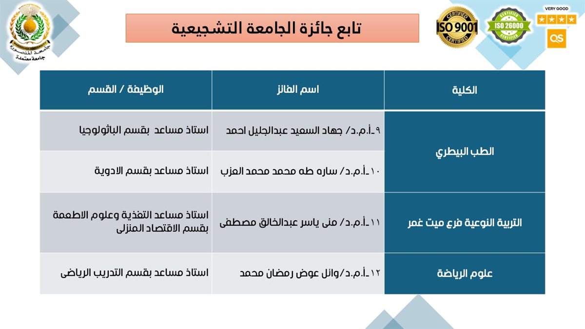 ومن كلية العلوم الدكتورة دعاء أحمد محمد علي كسبة – مدرس بقسم الكيمياء (كيمياء فيزيائية)، والدكتور فتحي سامي محمد عوض – أستاذ مساعد بقسم الكيمياء (كيمياء تحليلية). ومن كلية الطب البيطري الدكتورة جهاد السعيد عبدالجليل أحمد – أستاذ مساعد بقسم الباثولوجيا، والدكتورة سارة طه محمد محمد العزب – أستاذ مساعد بقسم الأدوية. ومن كلية التربية النوعية – فرع ميت غمر، الدكتورة منى ياسر عبدالخالق مصطفى – أستاذ مساعد بقسم التغذية وعلوم الأطعمة. ومن كلية علوم الرياضة الدكتور وائل عوض رمضان محمد – أستاذ مساعد بقسم التدريب الرياضي.