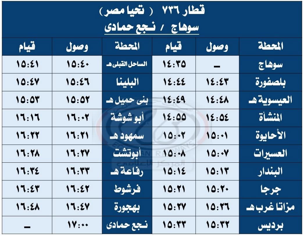 أعلنت الهيئة القومية للسكك الحديدية تشغيل قطاري 930 و929 (ثانية فاخرة) على خط القاهرة – أسيوط والعكس ابتداءً من 27 سبتمبر الجاري.