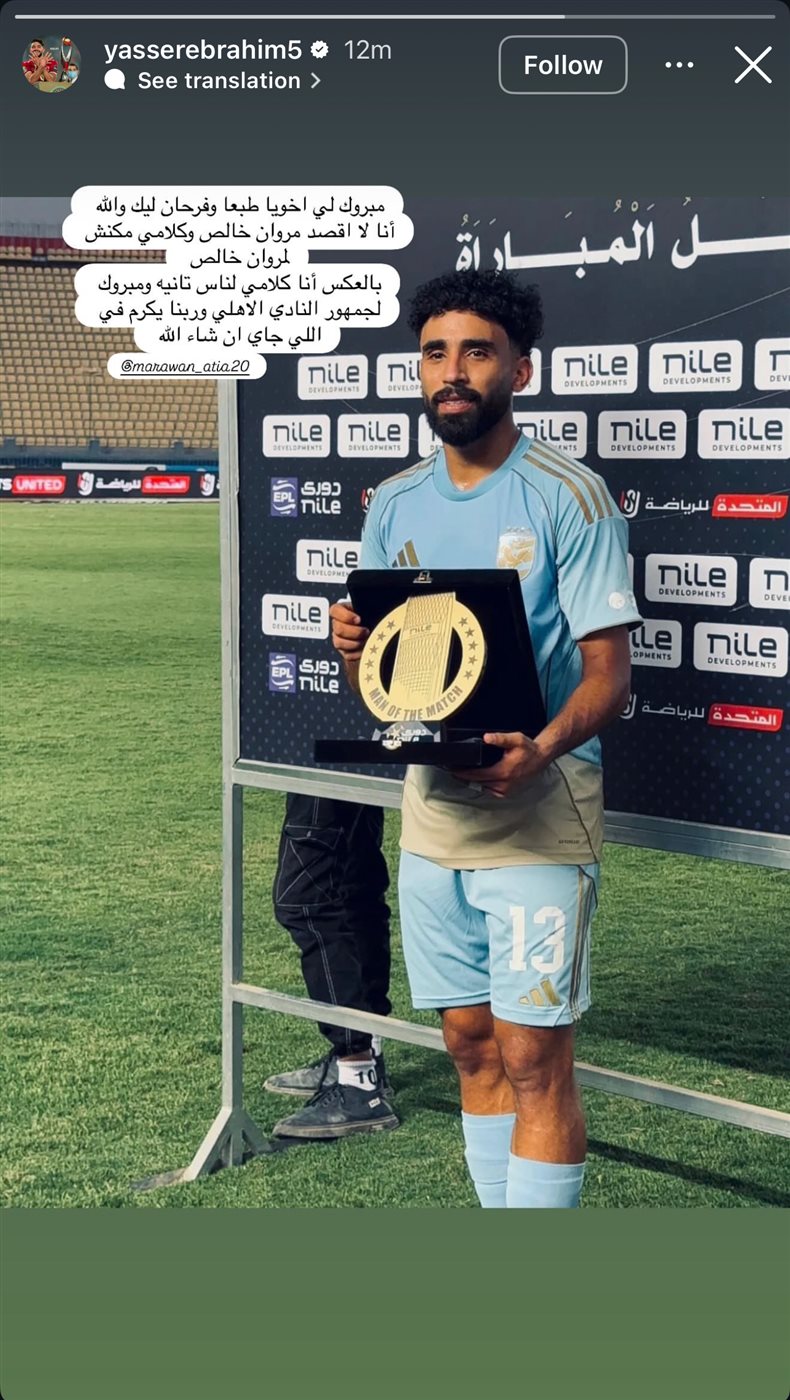 ونشر ياسر عبر حسابه علي إنستجرام صورة لمروان عطية بالجائزة، وكتب: مبروك لاخويا طبعا وفرحان ليك والله، أنا لا أقصد مروان خالص وكلامي مكنش لمروان خالص، بالعكس أنا كلامي لناس تانية، ومبروك لجمهور النادي الأهلي وربنا يكرم في اللي جاي إن شاء الله.