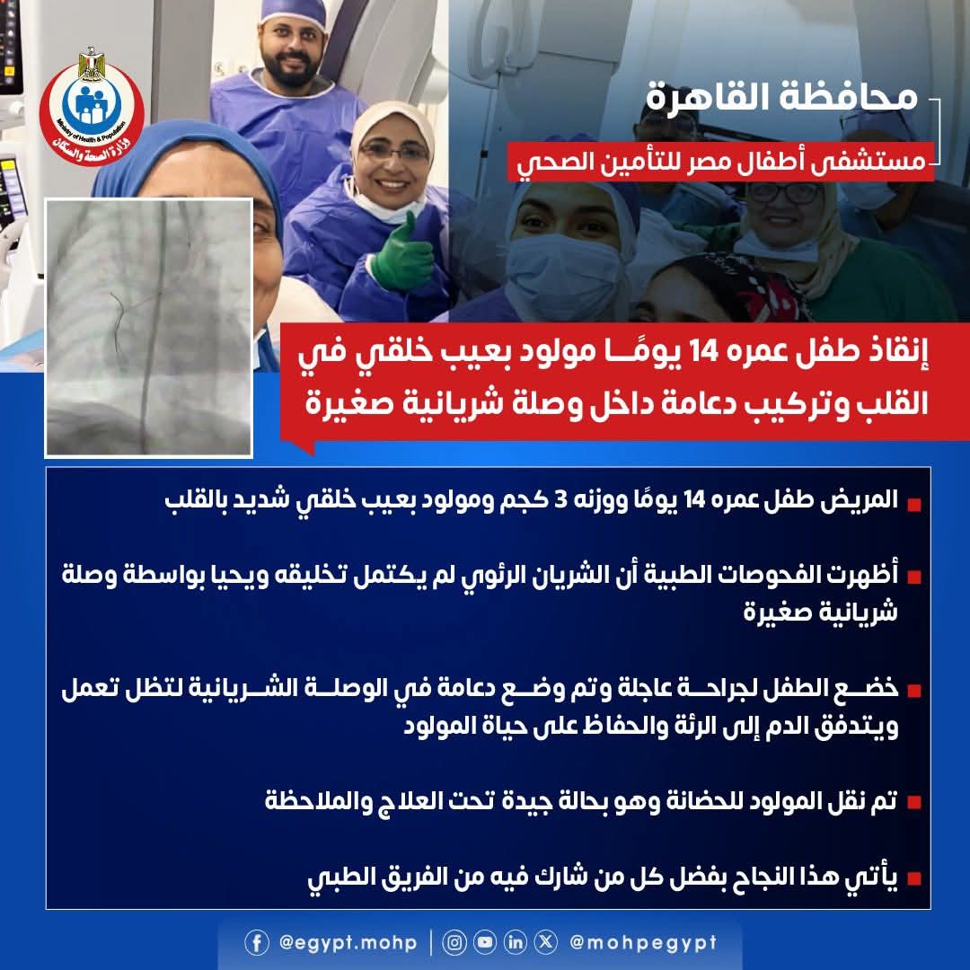 ويأتي هذا النجاح في إطار حرص وزارة الصحة والسكان على تطوير خدمات طب وجراحة قلب الأطفال، وتوفير أفضل رعاية طبية متخصصة للحالات الحرجة.