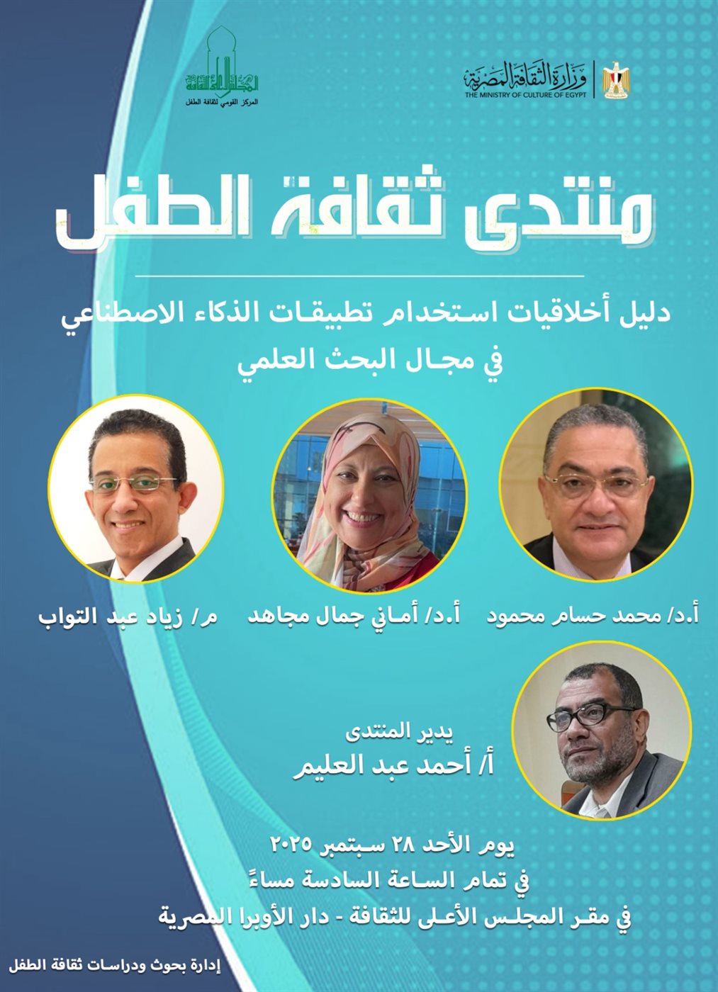 يقيم المركز القومي لثقافة الطفل التابع للمجلس الأعلى للثقافة، منتدى ثقافة الطفل بعنوان "دليل أخلاقيات استخدام تطبيقات الذكاء الاصطناعي في مجال البحث العلمي"، يوم الأحد القادم الموافق ٢٨ سبتمبر بالمجلس الأعلى للثقافة في تمام الساعة السادسة مساء.
