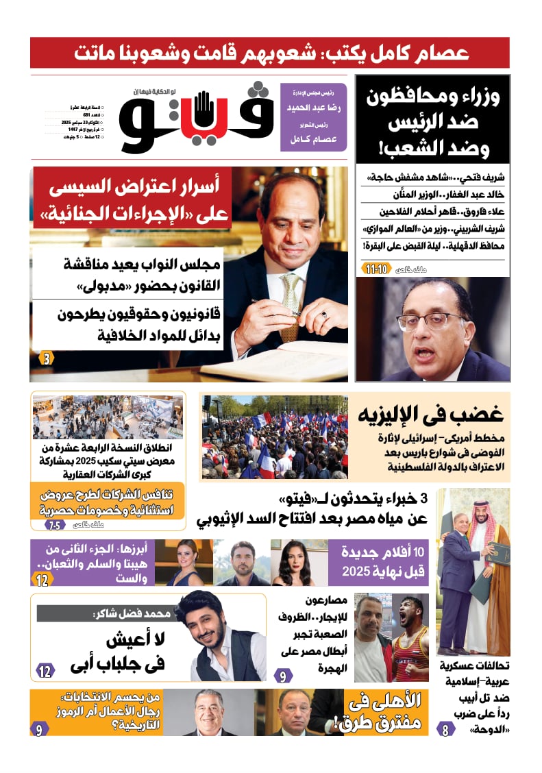 تتناول فيتو في عددها الجديد ملف جديد بعنوان وزراء ومحافظون ضد الرئيس وضد الشعب!.. شريف فتحي.. «شاهد مشفش حاجة».. خالد عبد الغفار.. الوزير المنَّان، علاء فاروق.. قاهر أحلام الفلاحين، شريف الشربيني.. وزير من «العالم الموازي» محافظ الدقهلية.. ليلة القبض على البقرة!.