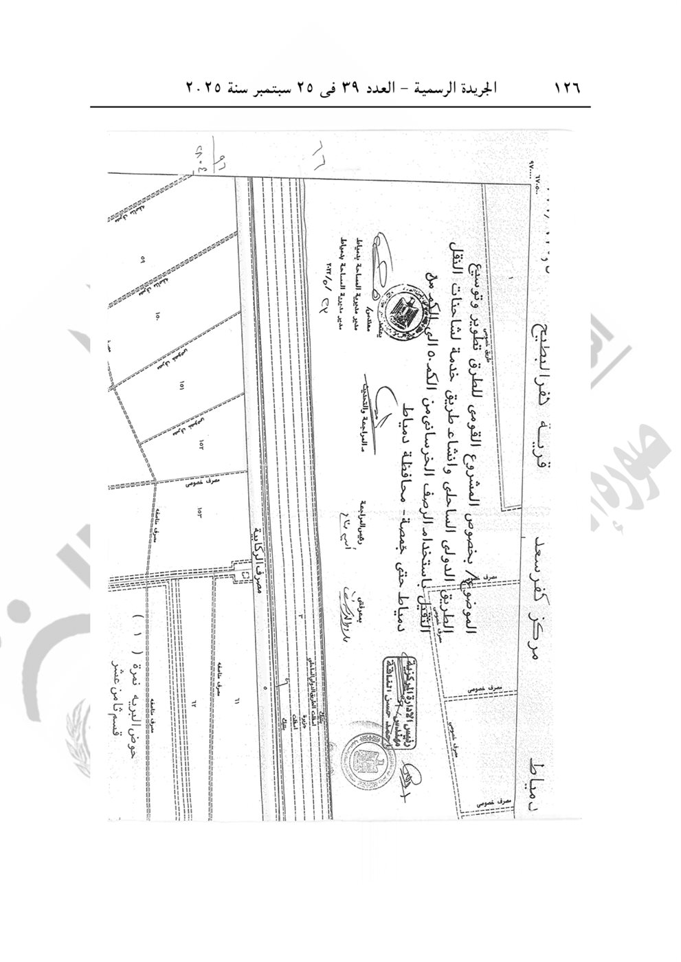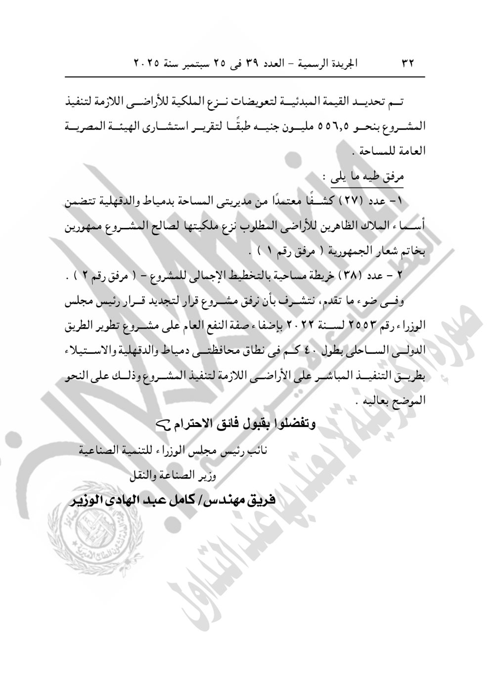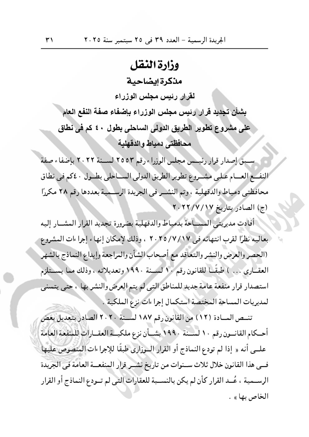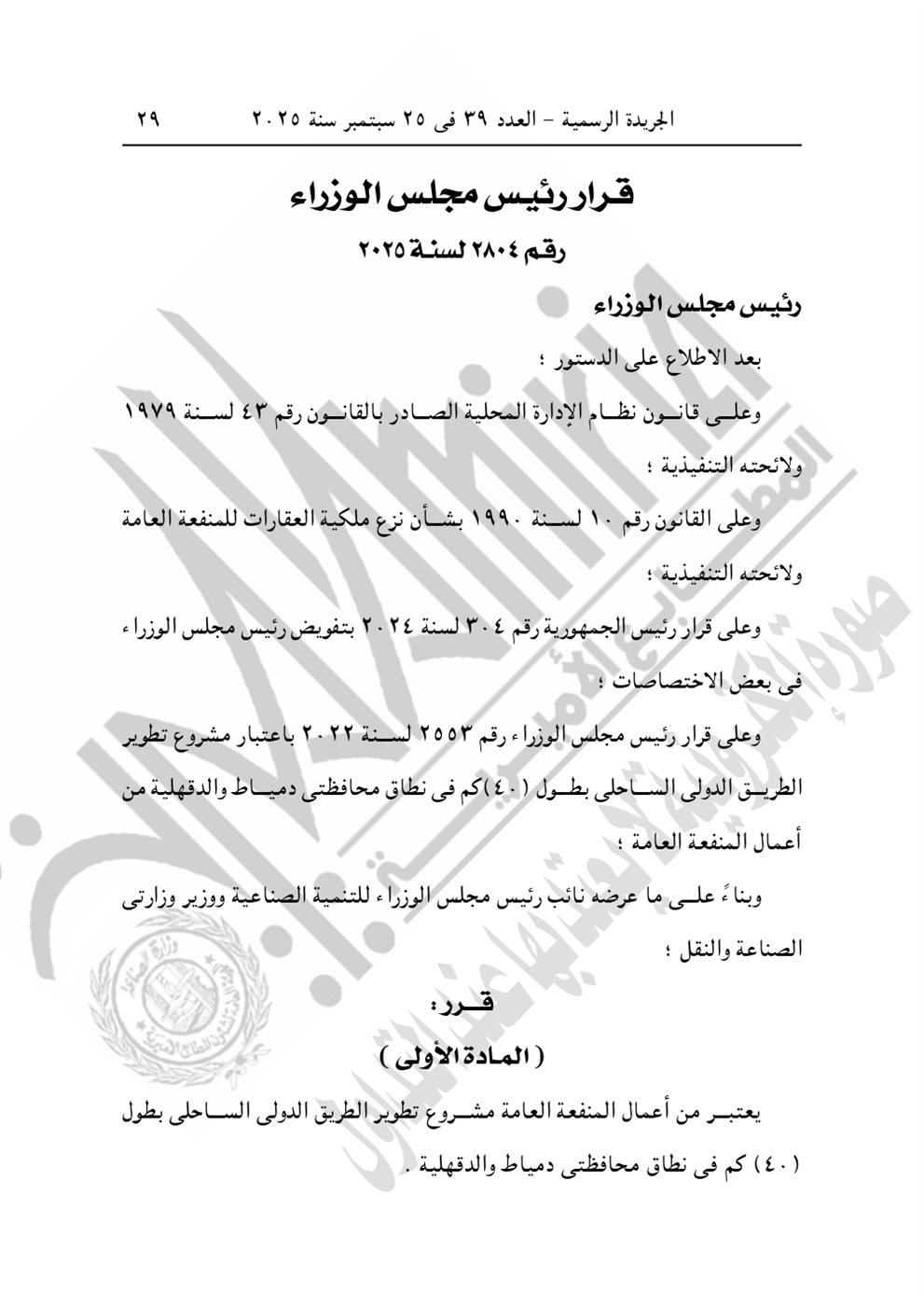 نشرت الجريدة الرسمية في عددها رقم 39، الصادر في 25 سبتمبر 2025، قرار رئيس الوزراء الدكتور مصطفى مدبولي رقم 2804 لسنة 2025، بشأن الاستيلاء بطريق التنفيذ المباشر على الأراضي والعقارات اللازمة لمشروع تطوير الطريق الدولي الساحلي بطول 40 كيلو في محافظتي دمياط والدقهلية.