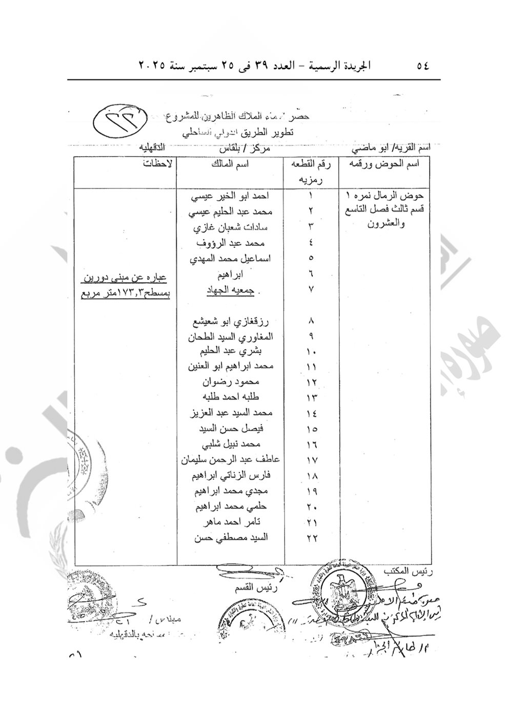 ويستولى بطريق التنفيذ المباشر على الأراضى والعقارات اللازمة لتنفيذ المشروع، مشروع تطوير الطريق الدولى الساحلى، والمبين موقعها ومساحتها وحدودها وأسماء مالكها الظاهرين بالمذكرة الإيضاحية والخرائط المساحية والكشوف.