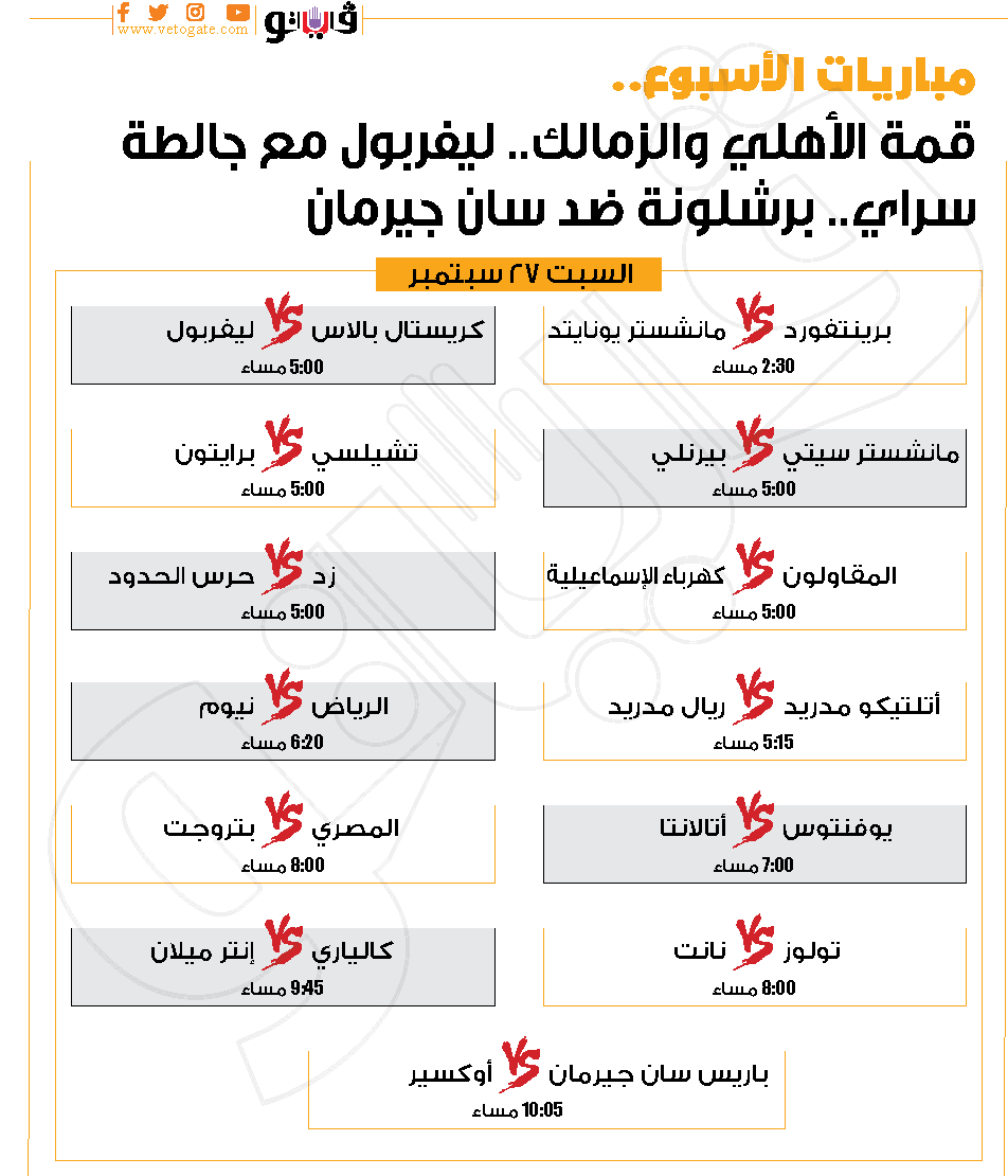 مباريات الأسبوع.. قمة الأهلي والزمالك.. ليفربول مع جالطة سراي.. برشلونة ضد سان جيرمان (إنفوجراف)