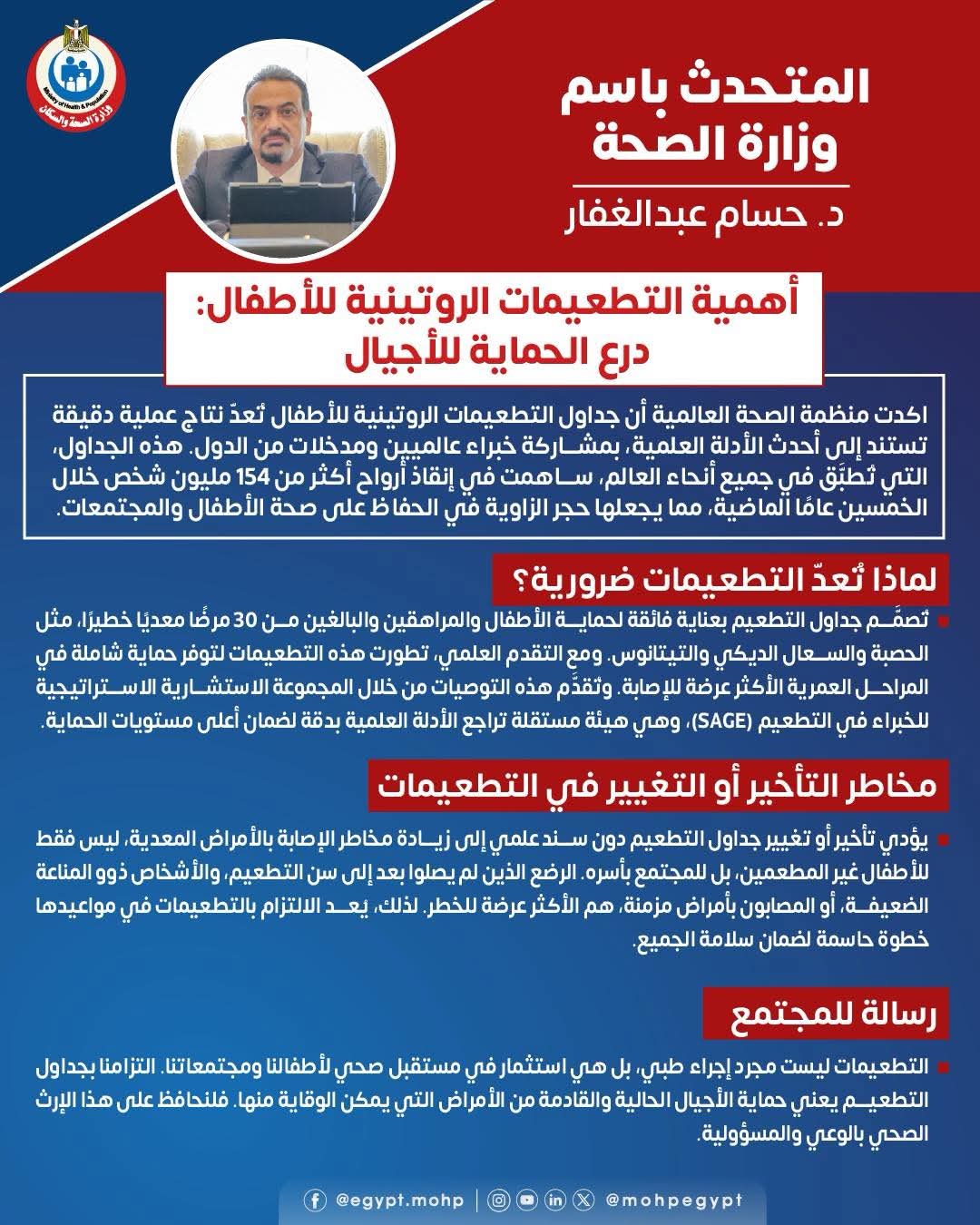 أكد عبد الغفار أن التطعيمات ليست مجرد إجراء طبي، بل هي استثمار في مستقبل صحي لأطفالنا ومجتمعاتنا.