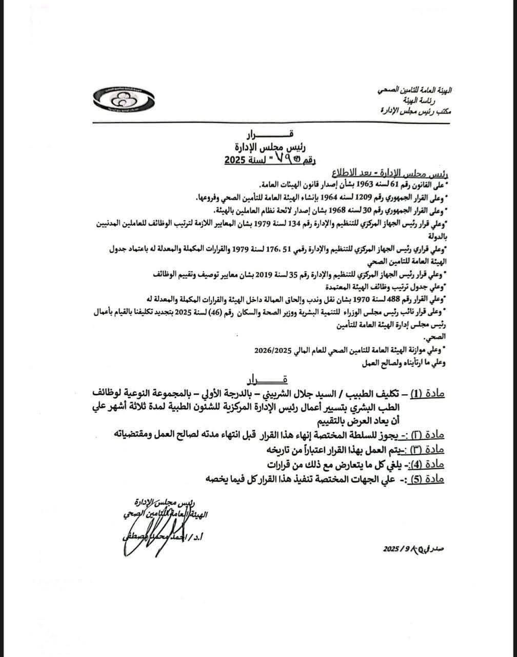 أصدر الدكتور أحمد مصطفى، رئيس مجلس إدارة الهيئة العامة للتأمين الصحي، القرار رقم (79) لسنة 2025، بتكليف الدكتور جلال الشربيني بالدرجة الأولى بالمجموعة النوعية لوظائف الطب البشري للقيام بأعمال رئيس الإدارة المركزية للشئون الطبية لمدة ثلاثة أشهر، على أن يعاد العرض للتقييم.