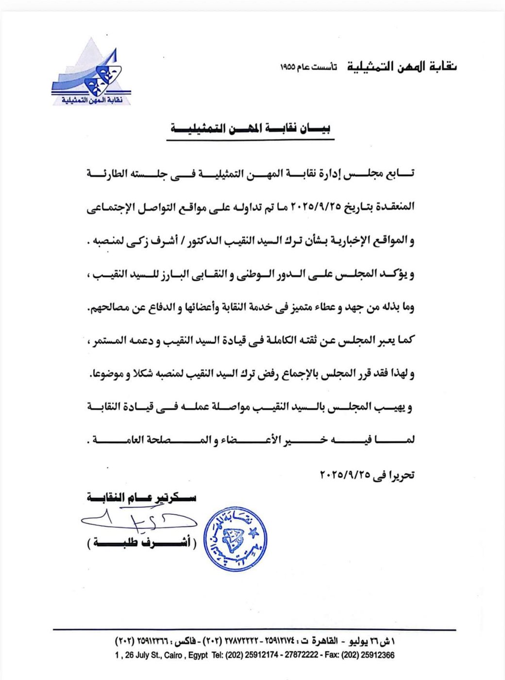 وعقد مجلس الإدارة جلسة طارئة يوم الأربعاء الموافق 25 سبتمبر 2025 لمتابعة ما تم تداوله عبر مواقع التواصل الاجتماعي والمواقع الإخبارية بشأن ترك النقيب، الدكتور أشرف زكي، لمنصبه.