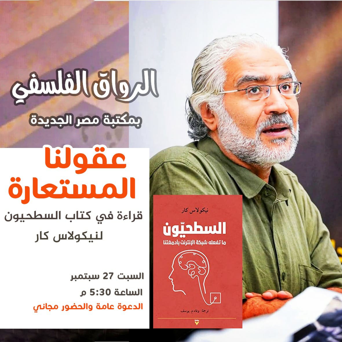 تستضيف مكتبة مصر الجديدة العامة غدًا السبت، صالونها الثقافي الشهري "الرواق الفلسفي"، الذي يعقد تحت عنوان "عقولنا المستعارة"، متناولًا كتاب "السطحيون: ما يفعله الإنترنت بأدمغتنا" للصحفي الأمريكي نيكولاس كار، والصادر عن دار دبليو دبليو نورتون وشركاؤه عام 2010.
