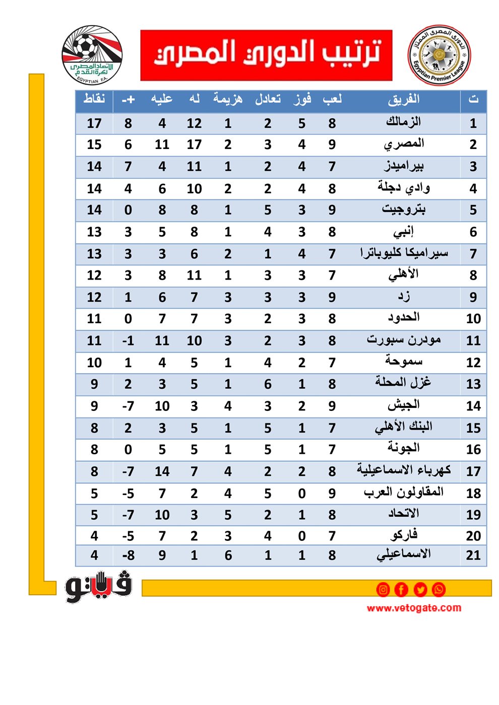 و تراجع الأهلي مركزين بعد انتهاء مباريات اليوم من الجولة التاسعة وقفز بيراميدز إلي المركز الثالث في جدول ترتيب الدوري الممتاز.