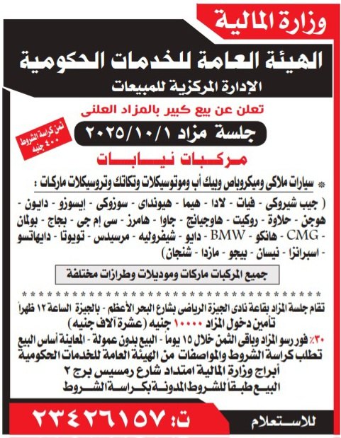 أعلنت وزارة المالية ممثلة في الهيئة العامة للخدمات الحكومية - الإدارة المركزية للمبيعات، عن تنظيم جلسة مزاد علني كبير يوم الأحد الموافق 1 أكتوبر 2025، لبيع مجموعة من المركبات والنفايات والمعدات المتنوعة.