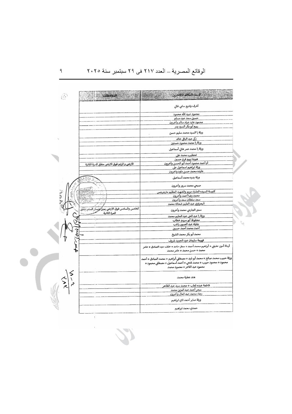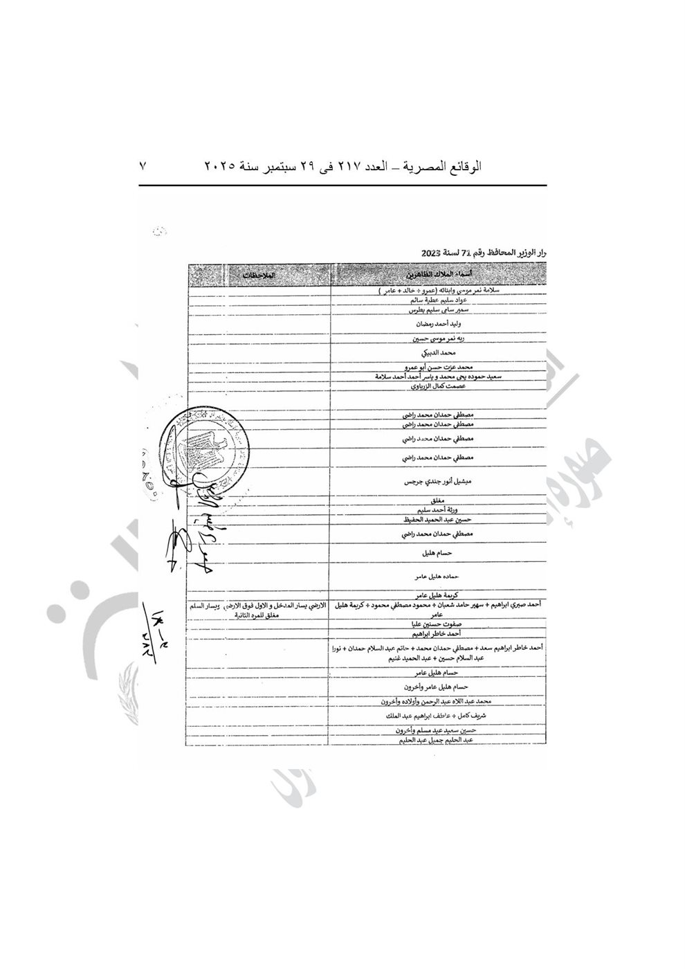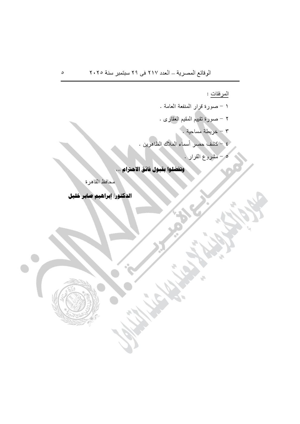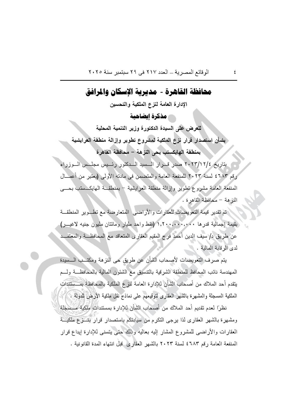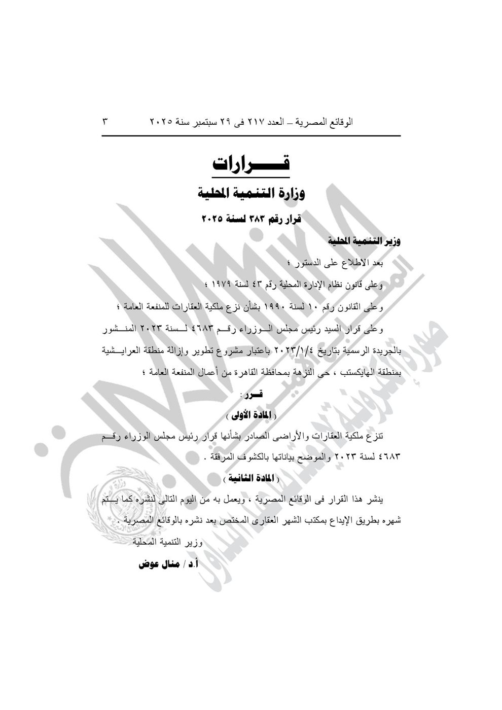 نشرت جريدة الوقائع المصرية في عددها رقم 217، الصادر في 29 سبتمبر 2025، قرار وزارة التنمية المحلية رقم 383 لسنة 2025، بشأن نزع ملكية العقارات والأراضى الصادر بشأنها قرار رئيس مجلس الوزراء رقـم 4683 لسنة 2023، موضحة كشوف حصر أسماء الملاك الظاهرين.