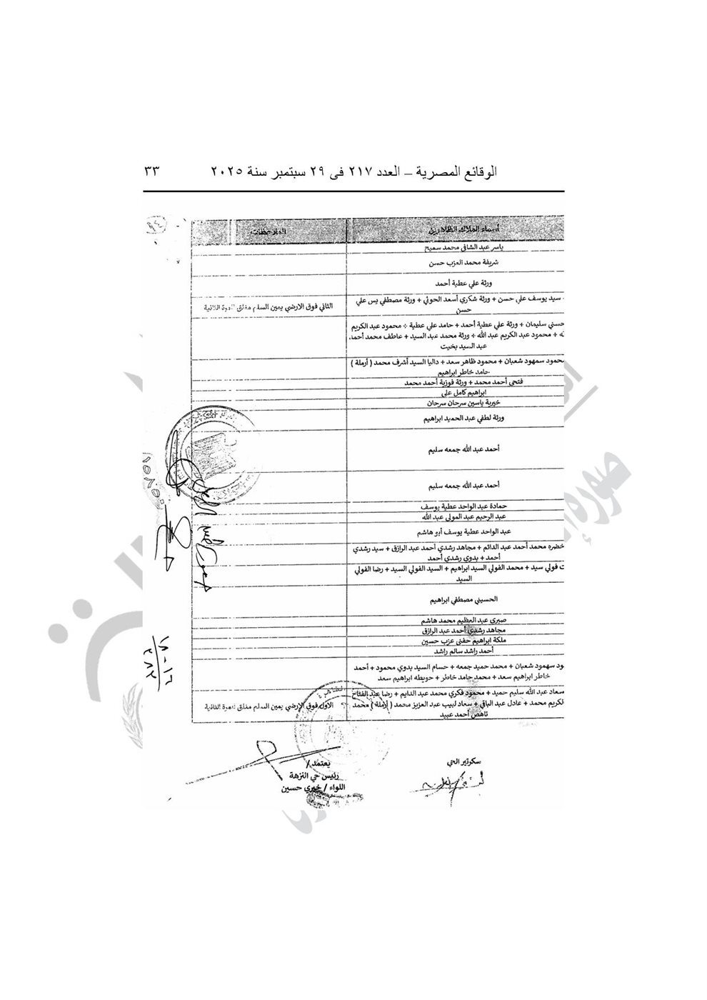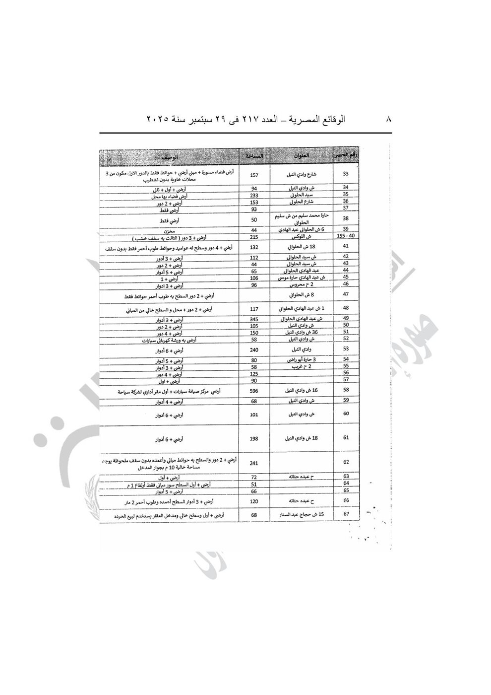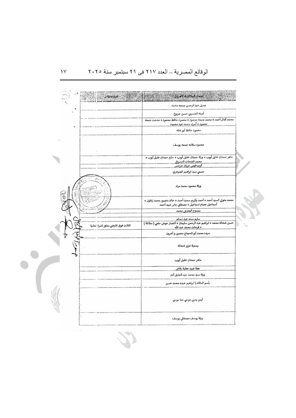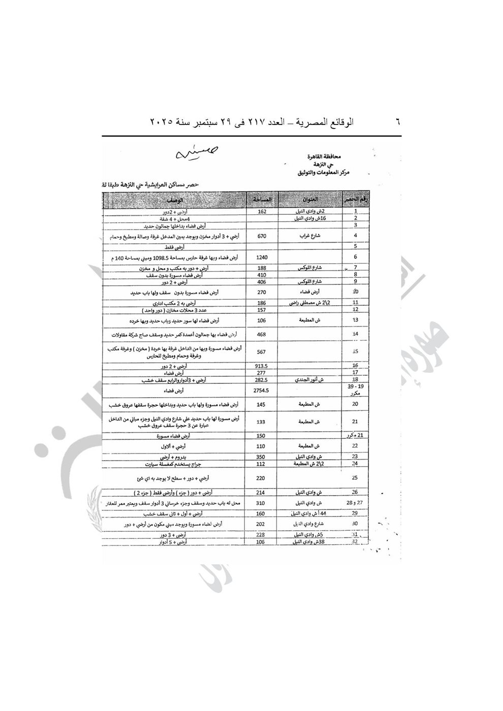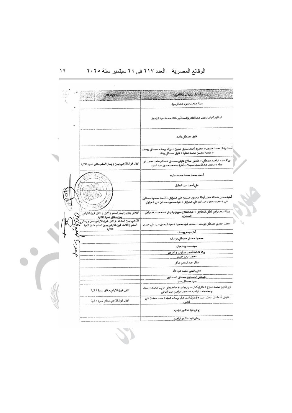 نشرت جريدة الوقائع المصرية في عددها رقم 217، الصادر في 29 سبتمبر 2025، قرار وزارة التنمية المحلية رقم 383 لسنة 2025، بشأن نزع ملكية العقارات والأراضى الصادر بشأنها قرار رئيس مجلس الوزراء رقـم 4683 لسنة 2023، موضحة كشوف حصر أسماء الملاك الظاهرين.