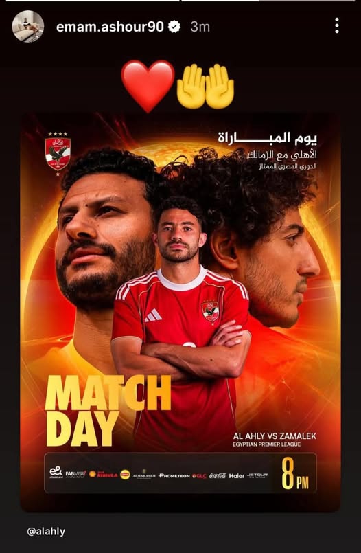 ونشر إمام عاشور ستوري عبر حسابه على انستجرام لدعم الفريق، وذلك في ظل غياب اللاعب بسبب الإصابة بفيروس A وهو ما يبعده عن الأهلي في الفترة الحالية.
