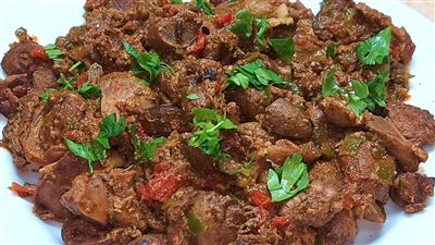 يُشوح البصل في السمن ثم تضاف الكبد والقوانص مع التوابل.