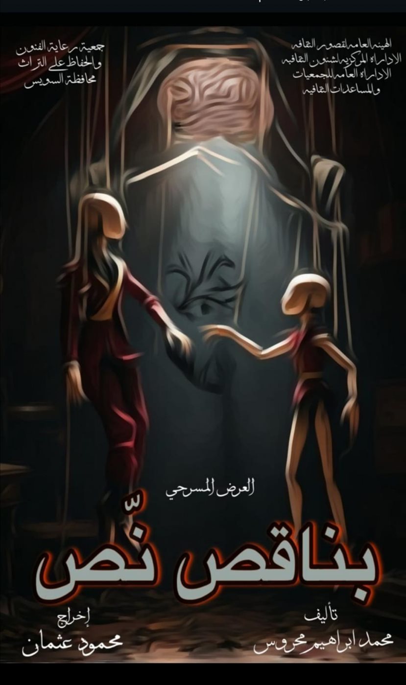 أما العرض الثاني بعنوان"بناقص نص" لفرقة جمعية رعاية الفنون والحفاظ على التراث بالسويس، تأليف محمد إبراهيم محروس، وإخراج محمود عثمان، ويعرض في الثامنة مساء.