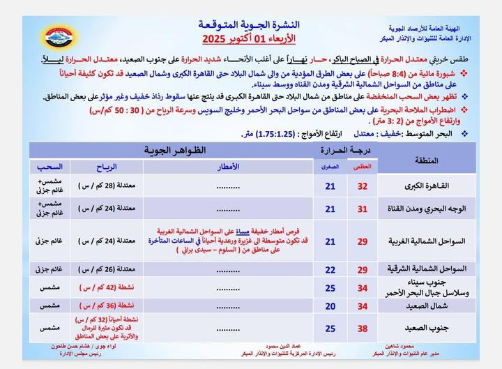 ومن المتوقع أن يسود طقس حار رطب نهارًا على القاهرة الكبرى وعلى الوجه البحري ورطب على السواحل الشمالية وشديد الحرارة على جنوب الصعيد وجنوب سيناء.