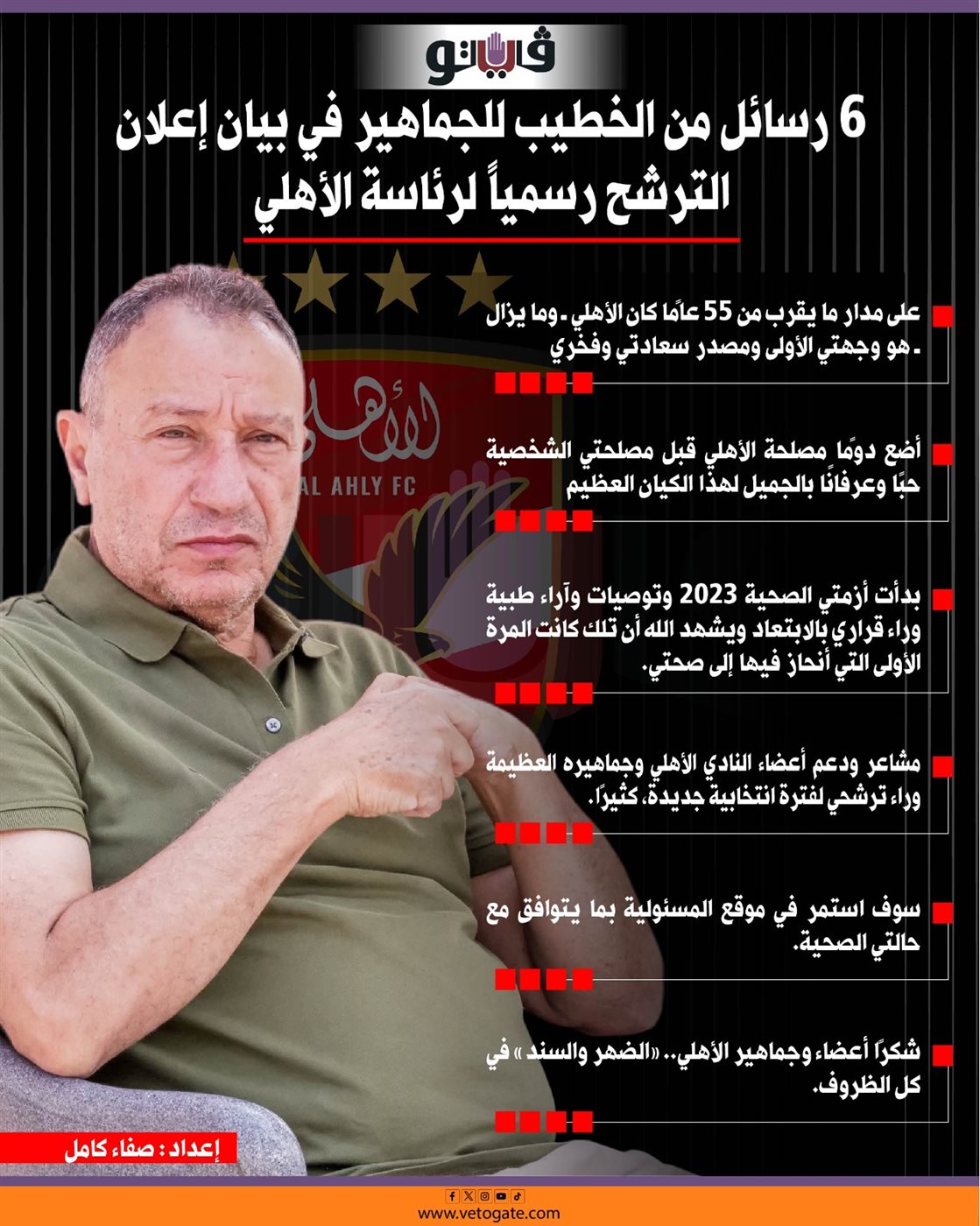 6 رسائل من الخطيب للجماهير في بيان إعلان الترشح رسميًا لرئاسة الأهلي (إنفوجراف)