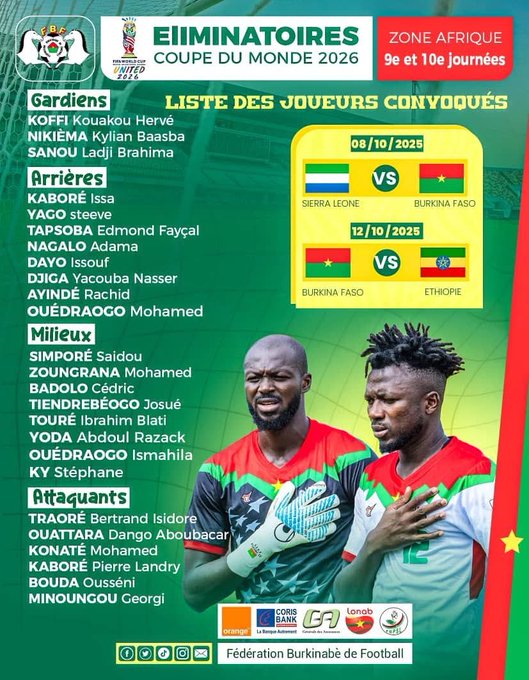أعلن منتخب بوركينا فاسو رسميًا قائمته استعدادًا لخوض مباريات التصفيات الإفريقية المؤهلة إلى كأس العالم 2026 خلال التوقف الدولي في شهر أكتوبر الحالي.