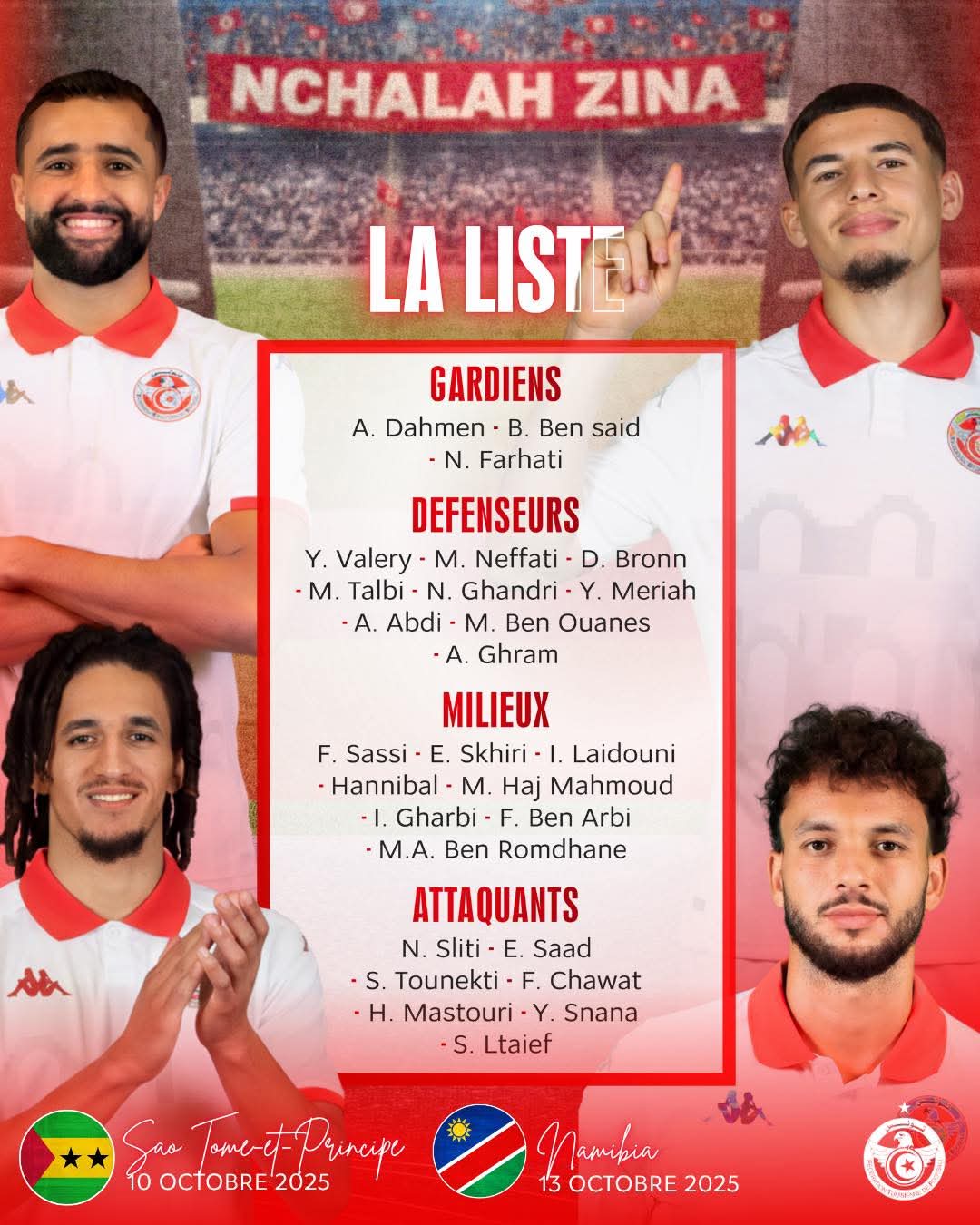 وضمت القائمة مجموعة من أبرز نجوم المنتخب، مثل فرجاني ساسي، إلياس السخيري، عيسى العيدوني، حنبعل المجبري، محمود المساكني، إلى جانب نجم الأهلي محمد علي بن رمضان الذي يواصل تثبيت مكانته الأساسية في المنتخب.