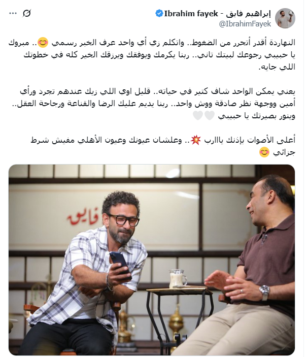 وتابع إبراهيم فايق رسالته فقال: "يعني يمكن الواحد شاف كتير في حياته.. قليل أوي اللي زيك عندهم تجرد ورأي أمين ووجهة نظر صادقة ووش واحد.. ربنا يديم عليك الرضا والقناعة ورجاحة العقل.. وينور بصيرتك يا حبيبي.. أعلى الأصوات بإذنك يااارب.. وعلشان عيونك وعيون الأهلي مفيش شرط جزائي".