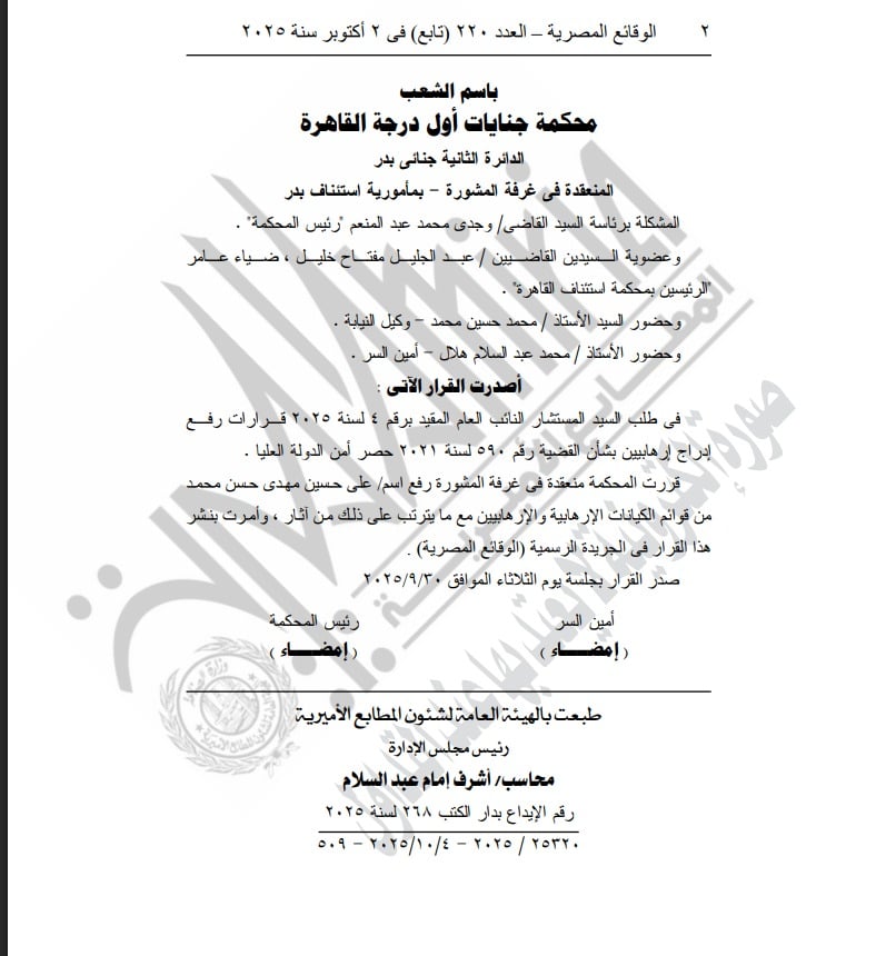 وجاء في الجريدة الرسمية، أنه بناءً على طلب المستشار النائب العام المقيد برقم ٤ لسنة ٢٠٢٥ قرارات رفع إدراج إرهابيين بشأن القضية رقم ٥٩٠ لسنة ۲۰۲۱ حصر أمن الدولة العليا قررت المحكمة منعقدة في غرفة المشورة رفع اسم علي حسين مهدي حسن محمد من قوائم الكيانات الإرهابية والإرهابيين مع ما يترتب على ذلك من آثار، وأمرت بنشر هذا القرار في الجريدة الرسمية.