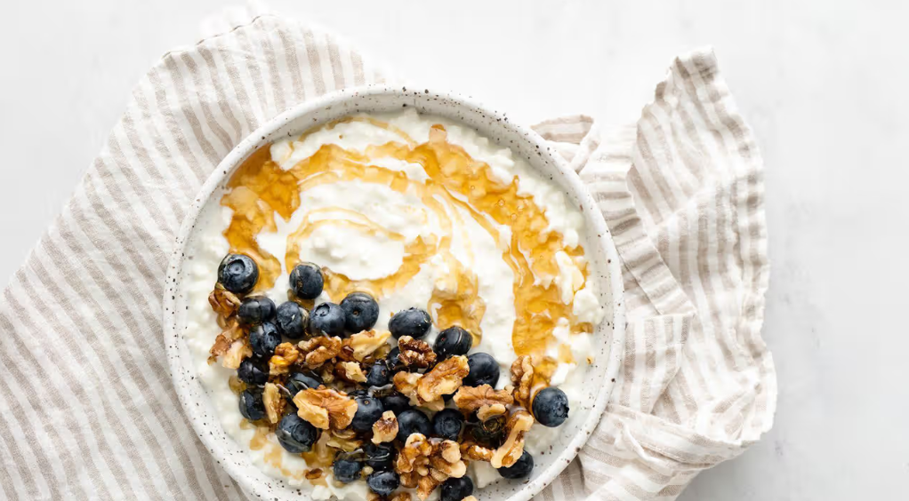 المكونات: جبن قريش، توت أزرق (أو فواكه أخرى)، جوز.