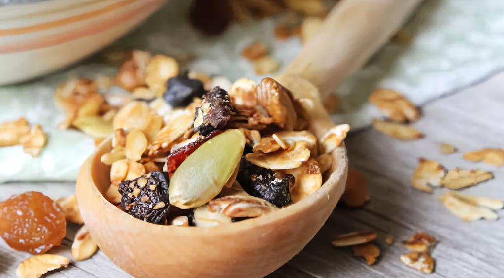 وجبة خفيفة ومناسبة للتنقل. تتكون من بذور اليقطين، خليط المكسرات، مسحوق الفلفل الحار، الملح، والفلفل. تُقلب المكونات معًا وتُحمّص في الفرن لمدة تتراوح بين 5 و10 دقائق.