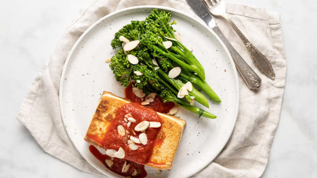7. شرائح التوفو المقرمشة مع البروكلي وصلصة الروميسكو
