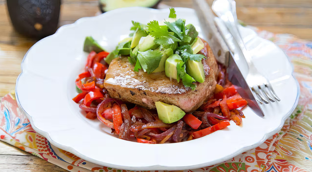 ستيك تونة يُدهن بالزبدة وعصير الليمون. يتميز بارتفاع محتواه من البروتين والألياف وانخفاضه في الكربوهيدرات والسكريات المضافة والدهون المشبعة والسعرات الحرارية. تتكون الصلصة من شرائح الفلفل الحلو الأحمر والبصل مع الأفوكادو.