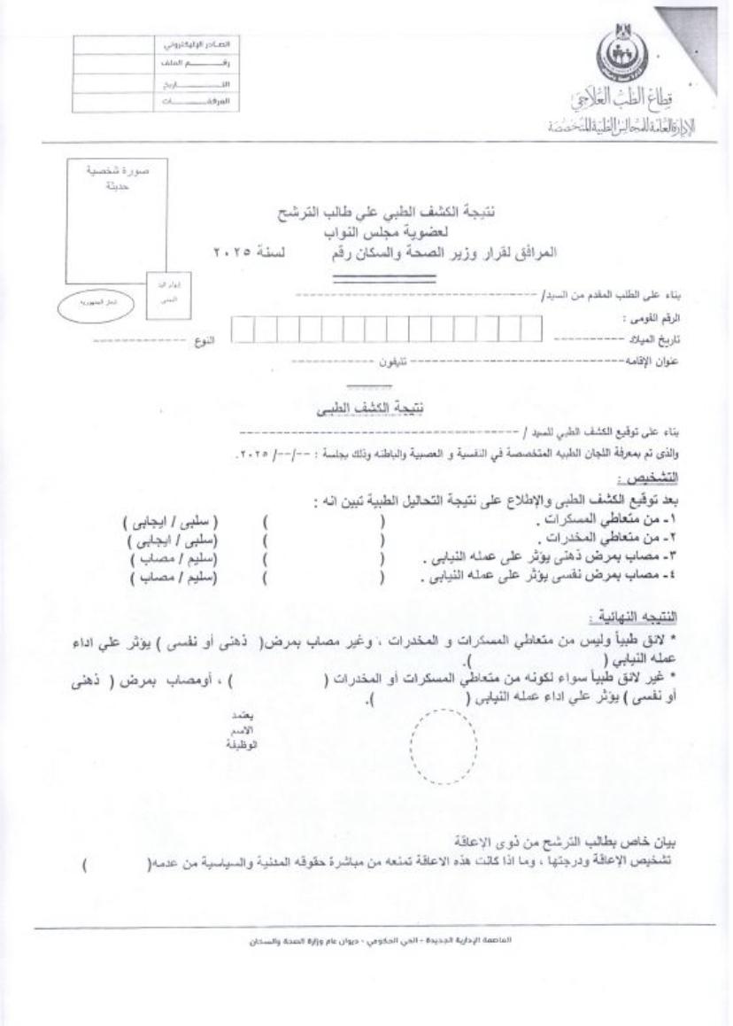 وجاء القرار استنادًا إلى أحكام الدستور وعدد من القوانين المنظمة من بينها قانون رعاية المريض النفسي رقم 1 لسنة 2009 وقانون مباشرة الحقوق السياسية رقم 45 لسنة 2014 وقانون مجلس النواب رقم 46 لسنة 2014 وقانون الهيئة الوطنية للانتخابات رقم 198 لسنة 2017 وقانون حقوق الأشخاص ذوي الإعاقة رقم 10 لسنة 2018 إلى جانب قرارات وزير الصحة السابقة المنظمة للكشوف الطبية للمرشحين.