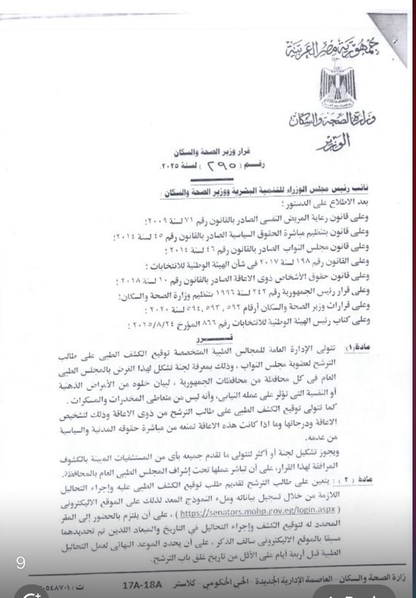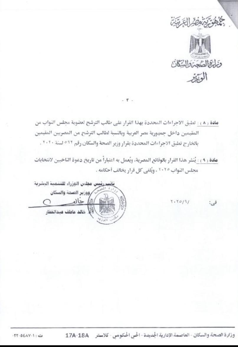 وصدر القرار عن الدكتور خالد عبد الغفار نائب رئيس مجلس الوزراء للتنمية البشرية ووزير الصحة والسكان بتاريخ سبتمبر 2025 في إطار التنسيق بين وزارتي الصحة والهيئة الوطنية للانتخابات لضمان نزاهة العملية الانتخابية وسلامة إجراءات الترشح